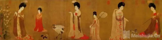 此畫描寫春夏之交時(shí)節(jié),一群服飾艷麗的貴族婦女在庭園里嬉戲、賞花的閑逸生活片斷。真實(shí)地反映了貴族婦女奢侈閑逸生活中的苦悶心境。